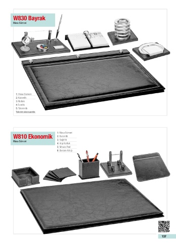 W830 Bayrak Masa Sümeni 1: Masa Sümeni 2: Kalemlik 3: Notluk 4: İsimlik 5: Takvimlik Takvim aksesuardır. 1: Masa Sümeni W810 Ekonomik 2: Kalemlik Masa Sümeni 3: Kağıtlık 4: Küp Notluk 5: Mouse Pad 6: Bardak Altlığı 137