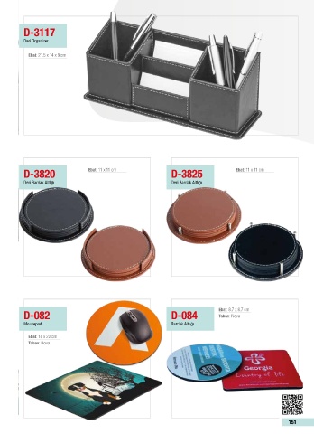 D-3117 Deri Organizer Ebat: 21.5 x 14 x 9 cm D-3820 Ebat: 11 x 11 cm D-3825 Ebat: 11 x 11 cm Deri Bardak Altlığı Deri Bardak Altlığı D-082 D-084 Ebat: 8.7 x 8.7 cm Taban: Nova Mousepad Bardak Altlığı Ebat: 18 x 22 cm Taban: Nova 151