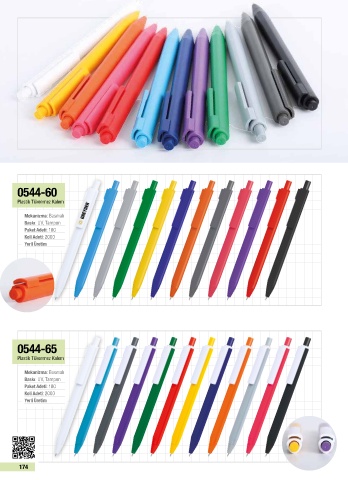 0544-60 Plastik Tükenmez Kalem Mekanizma: Basmalı Baskı: UV, Tampon Paket Adeti: 100 Koli Adeti: 2000 Yerli Üretim 0544-65 Plastik Tükenmez Kalem Mekanizma: Basmalı Baskı: UV, Tampon Paket Adeti: 100 Koli Adeti: 2000 Yerli Üretim 174