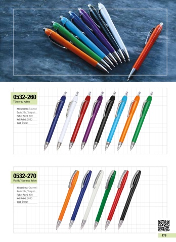 0532-260 Tükenmez Kalem Mekanizma: Basmalı Baskı: UV, Tampon Paket Adeti: 100 Koli Adeti: 2000 Yerli Üretim 0532-270 Plastik Tükenmez Kalem Mekanizma: Çevirmeli Baskı: UV, Tampon Paket Adeti: 100 Koli Adeti: 2000 Yerli Üretim 179