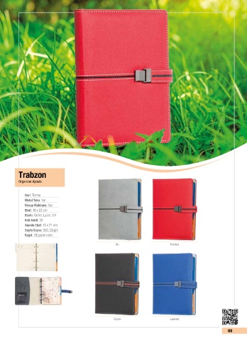 Trabzon Organizer Ajanda Deri: Termo Metal Toka: Var Hesap Makinası: Var Ebat: 18 x 23 cm Baskı: Gofre, Lazer, UV Koli Adeti: 30 Ajanda Ebat: 15 x 21 cm Sayfa Sayısı: 352, Çizgili Kağıt: 70 gram krem Gri Kırmızı Siyah Lacivert 69