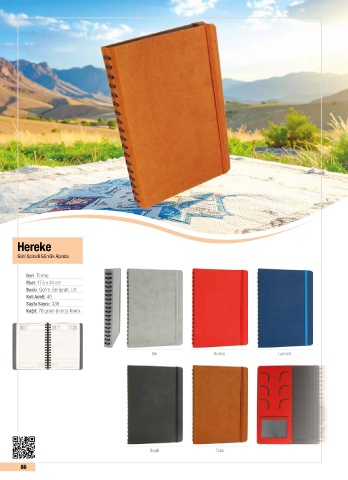 Hereke Gizli Spiralli Günlük Ajanda Deri: Termo Ebat: 17.5 x 24 cm Baskı: Gofre, Serigrafi, UV Koli Adeti: 40 Sayfa Sayısı: 336 Kağıt: 70 gram (Ivory) Krem Gri Kırmızı Lacivert Siyah Taba 86