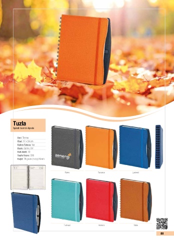 Tuzla Spiralli Günlük Ajanda Deri: Termo Ebat: 17 x 24 cm Kalem Tutucu: Var Baskı: Gofre, UV Koli Adeti: 40 Sayfa Sayısı: 336 Kağıt: 70 gram (Ivory) Krem Füme Turuncu Lacivert Turkuaz Kırmızı Taba 89