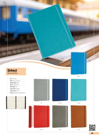 Sirkeci Gizli Spiralli Defter Mavi Deri: Termo Ebat: 15 x 21.5 cm Elastik Bant: Var Baskı: Gofre, UV Koli Adeti: 40 Sayfa Stili: Çizgili Sayfa Sayısı: 240 Kağıt: 80 gram (Ivory) Krem Gri Lacivert Turkuaz Kırmızı Füme Taba 95